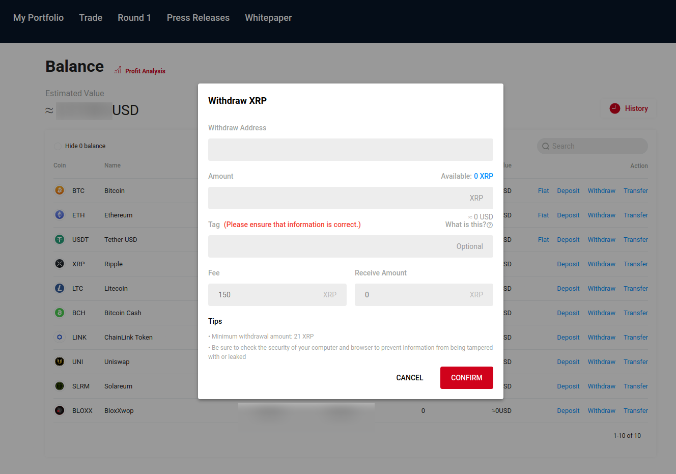 On the Wallet page, we can click the Withdraw button to start the withdrawal operation.